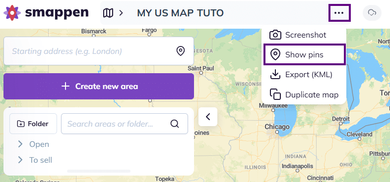To display the pins of a map, click on the “Show pins” button