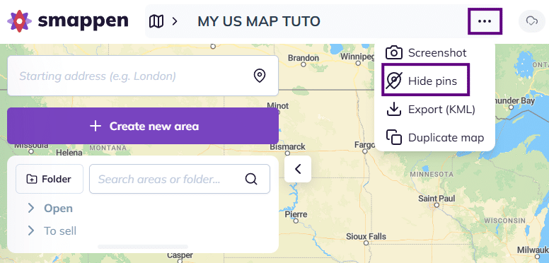 To hide the pins on a map, click on the three dots next to the title of your map at the top of your screen.