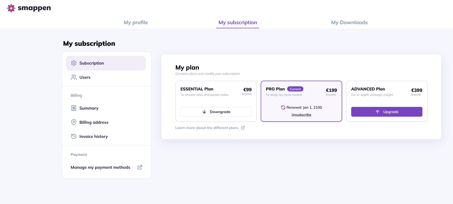 Change your subscription: Choose the plan you want, then click Upgrade or Downgrade.